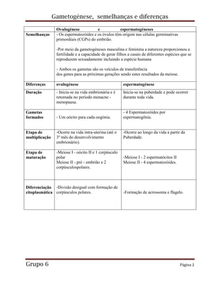 As semelhanças entre a ovulogênese e espermatogênese incluem que ambos os gametas se originam das células germinativas primordiais no embrião e transferem genes para as próximas gerações através da meiose. As principais diferenças são a duração dos processos, o número de gametas formados por célula e as etapas de multiplicação e maturação.