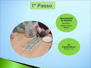 As crianças fizeram uma experiência plantando sementes de feijão e grão. Elas colocaram as sementes em potes de vidro com algodão e regaram com água, observando o crescimento das plantas. As meninas plantaram grão e os meninos plantaram feijão. As crianças também aprenderam uma canção sobre o crescimento das sementes.