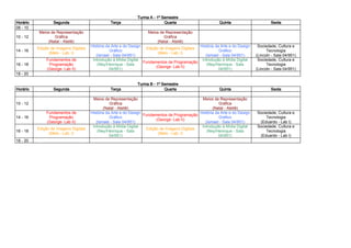 O horário da Turma A no primeiro semestre inclui aulas de Meios de Representação, Gráfica, História da Arte e do Design, Edição de Imagens Digitais, Fundamentos de Programação e Introdução à Mídia Digital nas segundas, terças, quartas e quintas. Nas sextas, há aulas de Sociedade, Cultura e Tecnologia. A Turma B tem aulas semelhantes, com exceção de algumas aulas que ocorrem em salas e laboratórios diferentes.