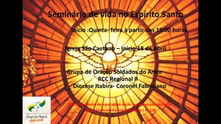 O seminário ocorrerá na Igreja São Caetano às quintas-feiras às 19h, começando em 18 de abril. O grupo Soldados do Amor da Diocese Itabira-Coronel Fabriciano promoverá o evento para receber a força do Espírito Santo e testemunhar a fé.