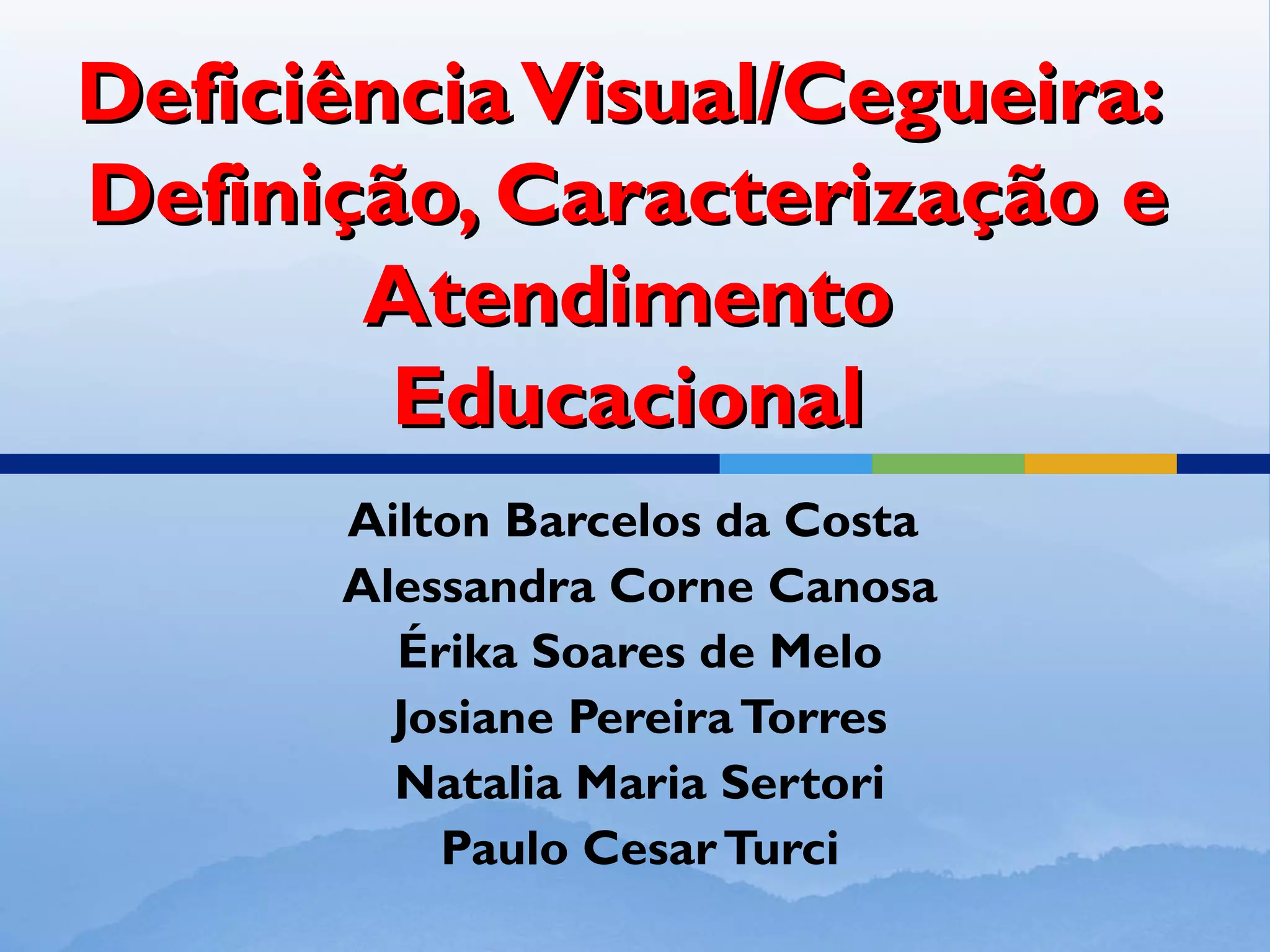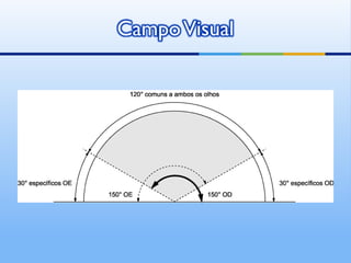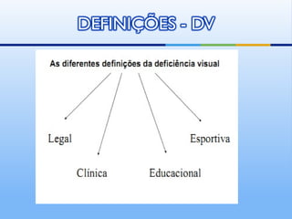 O documento descreve a história do atendimento à cegueira e baixa visão ao longo dos séculos em diferentes culturas e sociedades. Aborda também aspectos fisiológicos da visão, tipos de deficiência visual, desenvolvimento da linguagem e cognição em crianças cegas ou com baixa visão.