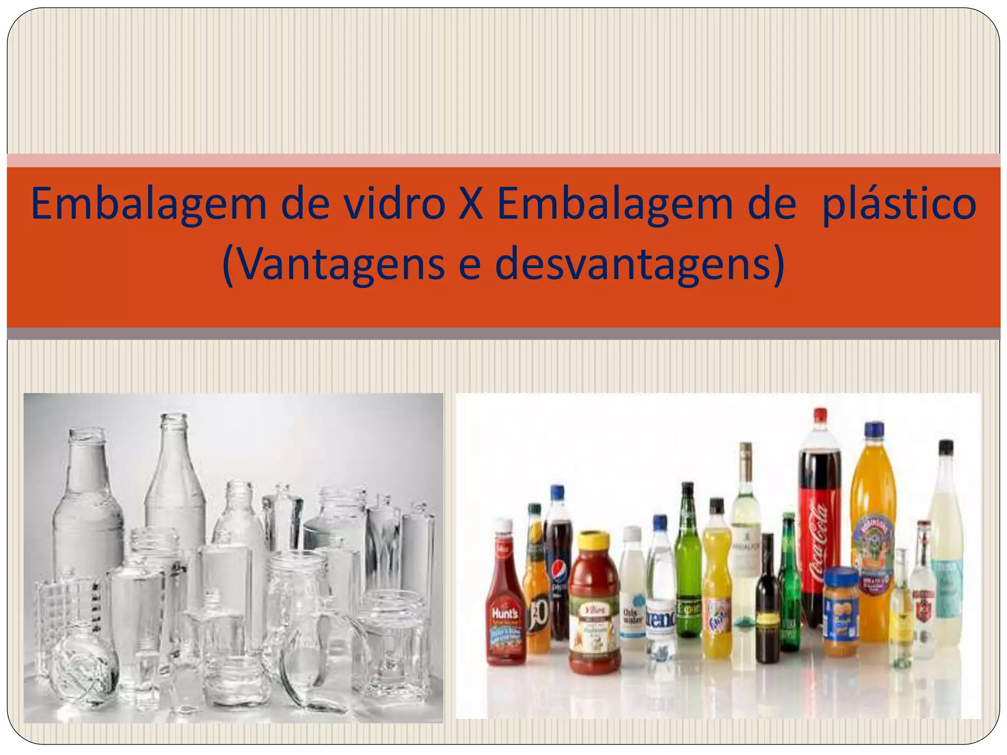 O documento compara embalagens de vidro e plástico, discutindo suas vantagens e desvantagens. O vidro é mais durável e reciclável, mas também é pesado e pode quebrar. O plástico é leve e maleável, porém causa grande poluição e demora séculos para se decompor. Embora prático, o uso excessivo de plástico tem sérios impactos ambientais.