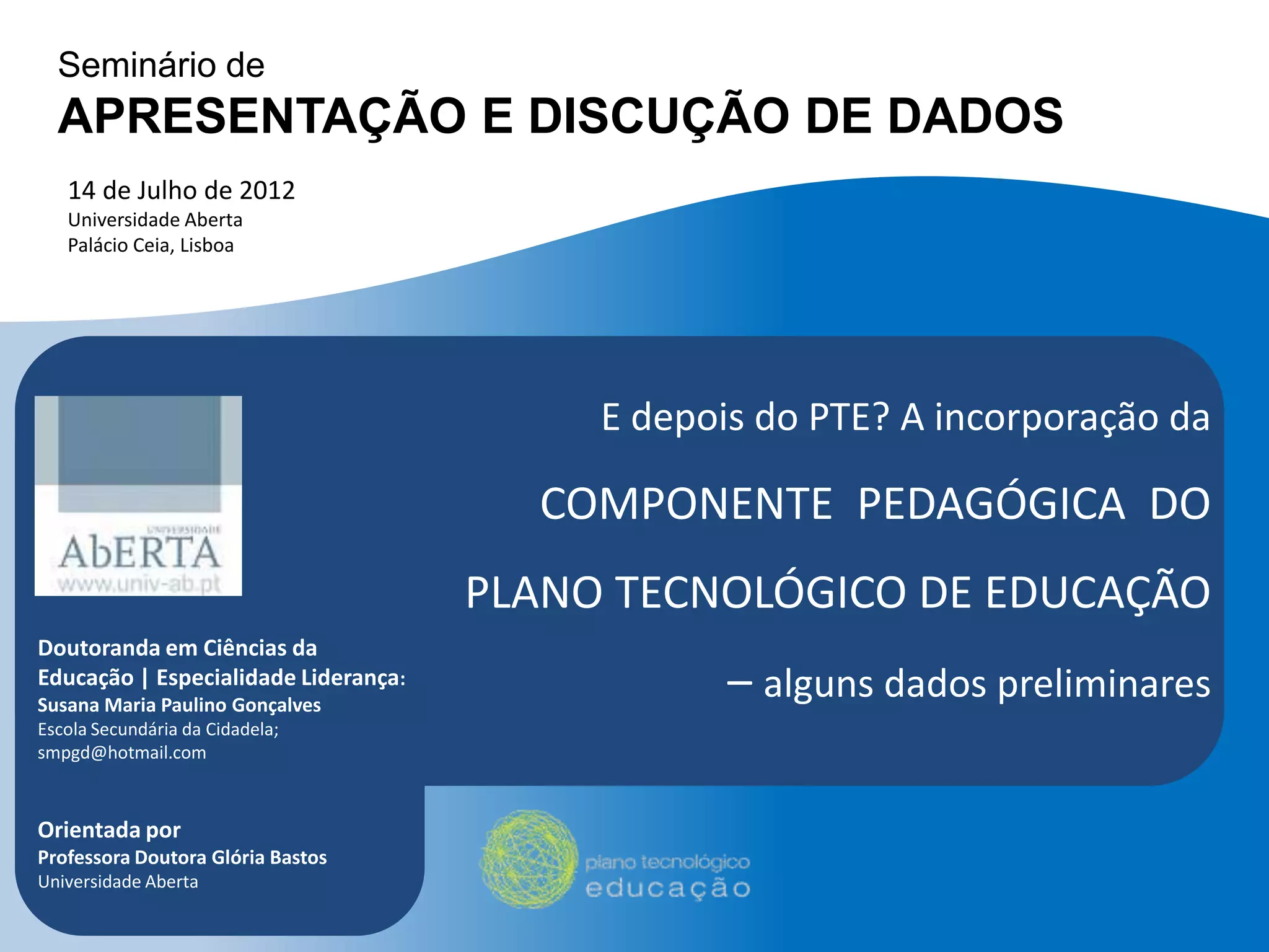 O documento apresenta dados preliminares sobre a incorporação da componente pedagógica do Plano Tecnológico de Educação em Portugal, destacando a modernização das escolas e a utilização de TIC pelos docentes. Os resultados indicam que as TIC estão integradas nas práticas de ensino, beneficiando tanto alunos quanto professores, embora alguns objetivos de formação e certificação das competências TIC ainda não tenham sido totalmente alcançados. A pesquisa foi conduzida por Susana Maria Paulino Gonçalves e discutida em um seminário na Universidade Aberta.