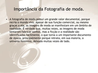 O documento descreve a história da fotografia de moda desde seus primórdios no século XIX até os dias atuais. Destaca que a fotografia de moda teve um papel importante na documentação do mundo da moda e dos sonhos fabricados pelas imagens ao longo do tempo, desde as primeiras publicações do gênero na década de 1880 até os dias atuais, quando a fotografia digital se tornou predominante.