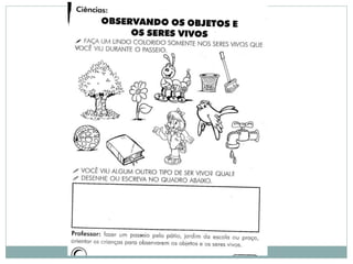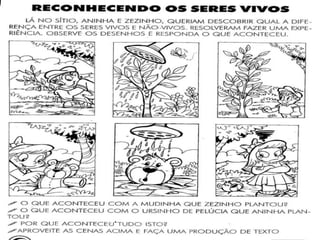 Este documento apresenta um plano de aula sobre fatores vivos e não vivos do meio ambiente. O plano inclui competências, estratégias, recursos, avaliação e tempo previsto para 8 aulas. As atividades envolvem identificar esses fatores em imagens e no jardim da escola, assistir ao filme "O Lorax" e debater sobre desmatamento.
