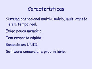 O documento descreve o sistema operacional em tempo real QNX: (1) É baseado em microkernel e roda a maior parte do código como processos separados; (2) Seu kernel é pequeno e focado em escalonamento, comunicação e timers; (3) Foi desenvolvido na década de 1980 e usado em vários setores como automotivo e indústria.