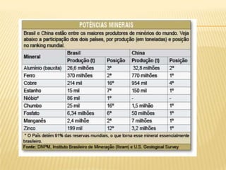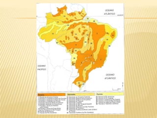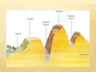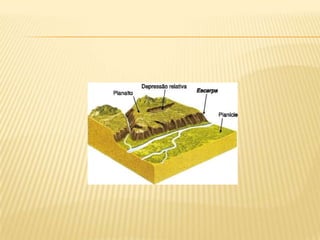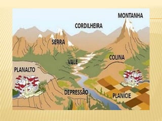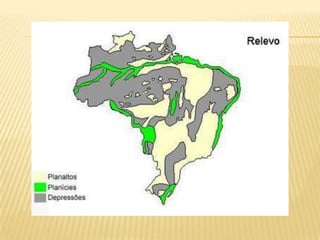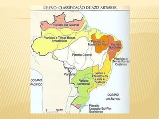 O documento apresenta um resumo sobre os principais aspectos do relevo brasileiro, incluindo sua classificação, formação e agentes modeladores. É descrita a divisão do relevo proposta por Aroldo de Azevedo e Aziz Ab'Saber, identificando planaltos, chapadas, serras, planícies e depressões que compõem o relevo do país. Também são explicados os processos geológicos e agentes externos responsáveis pela modelagem das diferentes formas de relevo encontradas no Brasil.