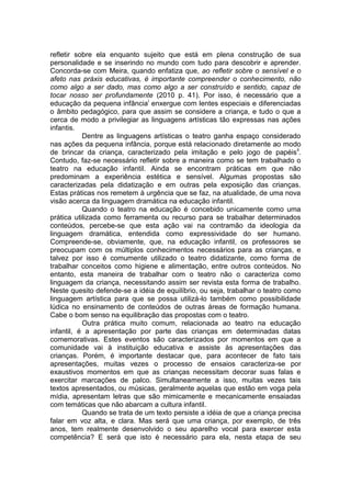 1) O documento discute a linguagem dramática na educação da pequena infância e a importância da formação continuada de professores nesta área.