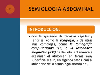 O documento discute a semiologia abdominal, incluindo a história clínica e exame abdominal. Fornece detalhes sobre a abordagem de pacientes com queixas abdominais e a importância de obter uma história clínica completa antes de realizar o exame físico.