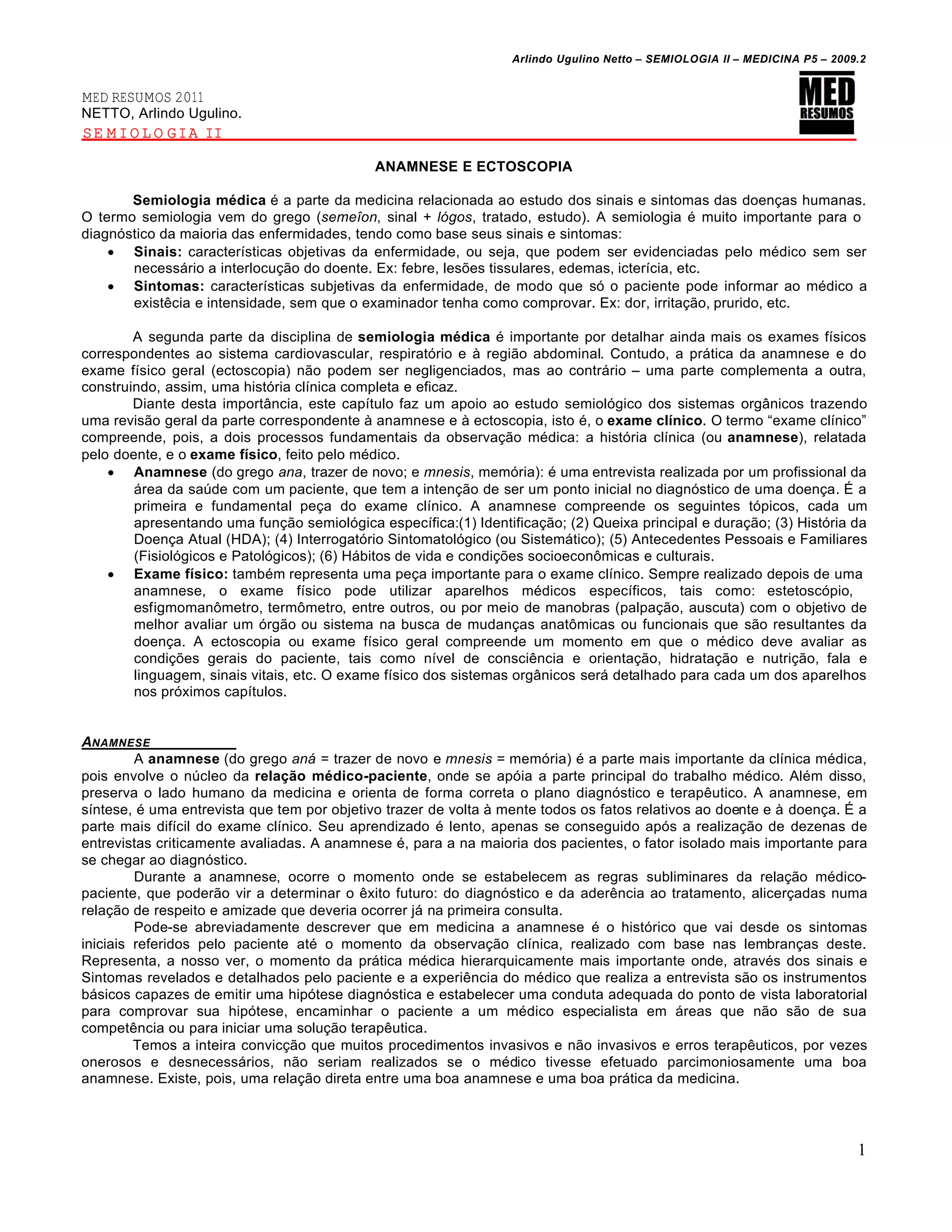 [1] A anamnese é a parte mais importante do exame clínico médico, pois estabelece a relação médico-paciente e fornece informações essenciais para o diagnóstico e tratamento. [2] A anamnese inclui a identificação do paciente, a queixa principal, a história da doença atual e interrogatório sobre antecedentes pessoais e familiares. [3] A história da doença atual deve explorar detalhadamente o início, duração, características e evolução dos sintomas do pac