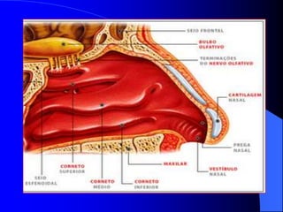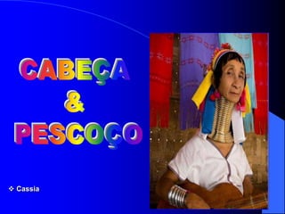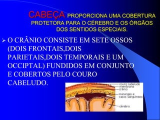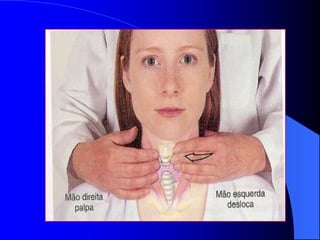 O documento fornece informações sobre a anatomia e avaliação da cabeça e pescoço. Resume que o crânio protege o cérebro e órgãos dos sentidos e consiste em sete ossos fundidos. Descreve técnicas para inspecionar, palpar e auscultar estruturas como crânio, pescoço, linfonodos, tireóide, traquéia e vasos do pescoço.