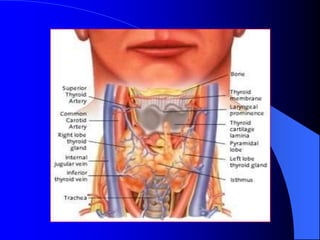 O documento discute a anatomia e avaliação da cabeça e pescoço. Ele descreve os ossos do crânio, regiões da cabeça, técnicas de avaliação do crânio, pescoço, linfonodos, tireóide, artérias carótidas e veias jugulares. Também discute inspeção e exame da face.