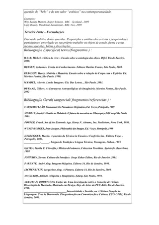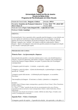 [1] O documento apresenta a ementa de um curso sobre a imagem e sua relação com a cultura no meio urbano. [2] Abordará questões como a seleção e valoração da imagem pelo sujeito e sua relação com objetos e linguagem. [3] O programa inclui discussões sobre a imagem a partir do sujeito, objeto e de si mesma, além de exemplos audiovisuais para ilustrar os temas.