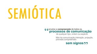 [1] A aula introduz os conceitos fundamentais da semiótica, que envolve a compreensão de todos os processos de comunicação através de signos. [2] Um signo representa algo para alguém e pode ser um ícone, índice ou símbolo. [3] De acordo com Peirce, a semiótica estuda a primidade, secundidade e terceiridade na interpretação e uso de signos.