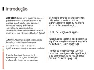 O documento apresenta uma introdução à semiótica, definindo-a como a teoria geral dos signos e dos processos significativos na natureza e cultura. A semiótica estuda a ação dos signos, tendo uma visão dinâmica da significação como processo. Investiga também o processo dinâmico da representação através dos signos.