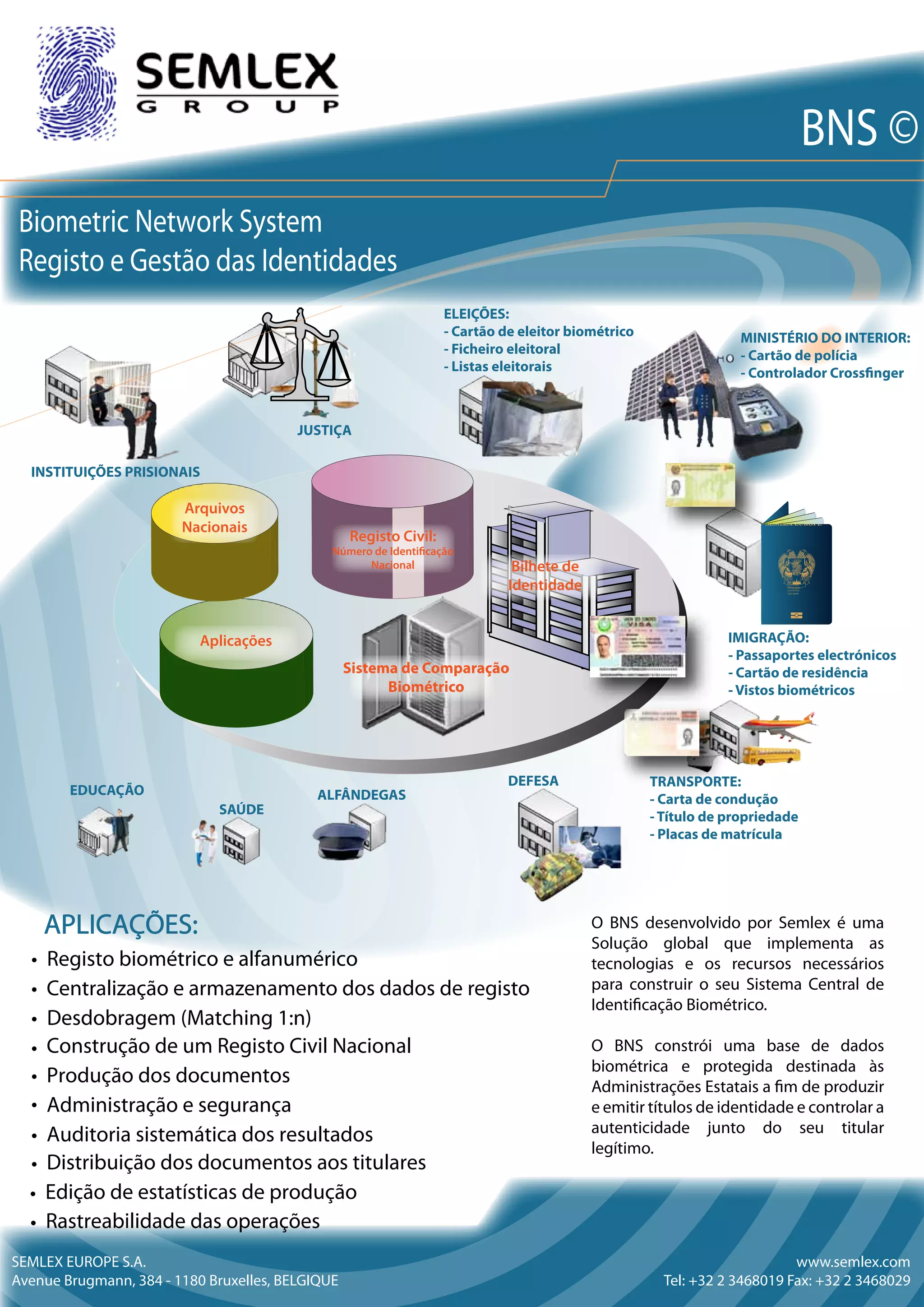 O documento descreve o Sistema de Comparação Biométrico (BNS) desenvolvido pela SEMLEX EUROPE para implementar sistemas de identificação biométrica para governos. O BNS constrói uma base de dados biométrica e protegida para emitir documentos de identidade e controlar a autenticidade dos titulares. Ele fornece aplicações para registro civil, educação, saúde, alfândegas, defesa, transporte, imigração, eleições, ministério do interior e justiça.