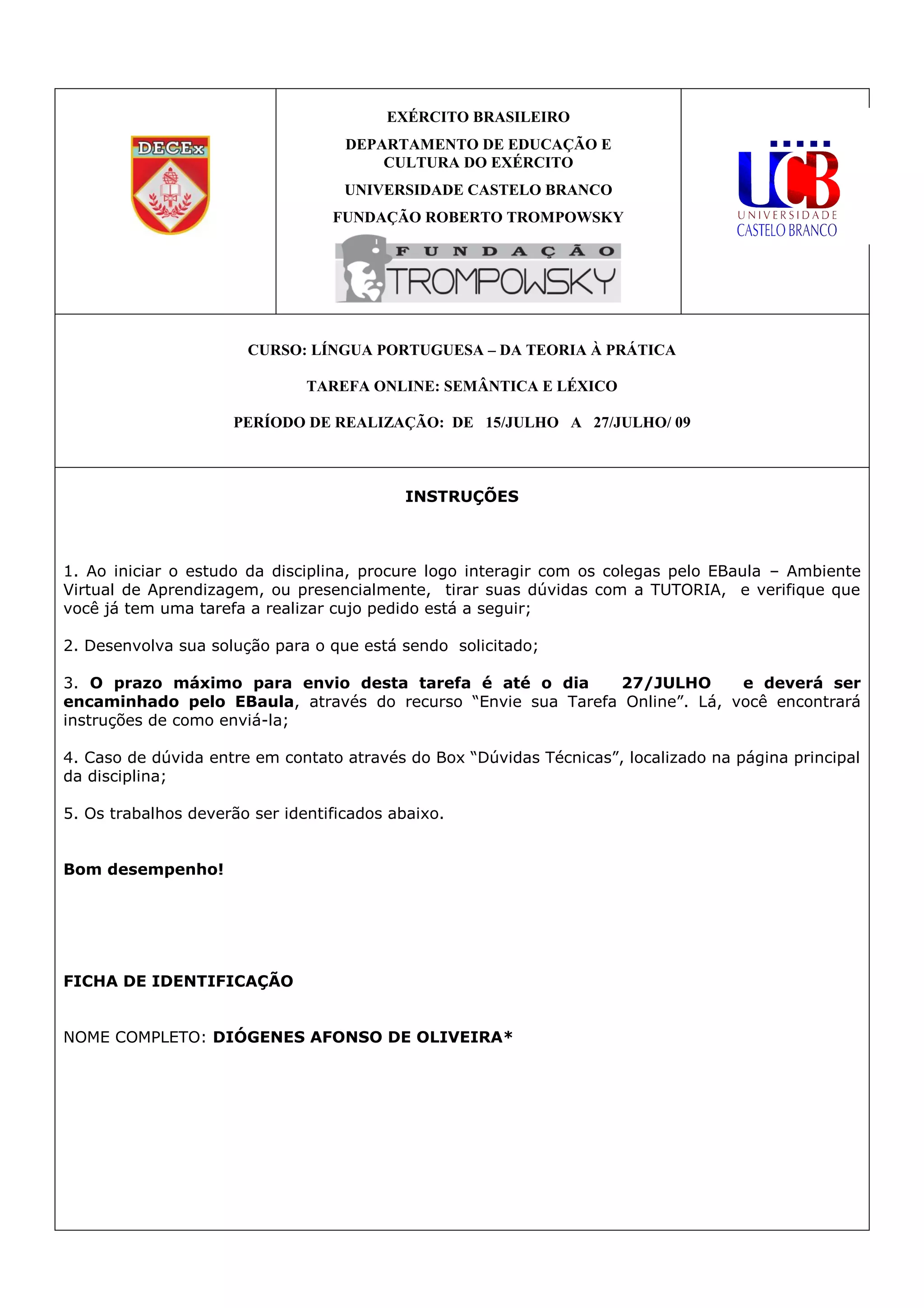 Este documento fornece instruções para uma tarefa online sobre semântica e léxico para um curso de Língua Portuguesa da Universidade Castelo Branco. Os alunos devem discutir pares de palavras com relações antonímicas e sinonímicas, explicar conceitos de semântica e pragmática, e analisar relações semânticas em textos literários, demonstrando compreensão de polissemia, hiperonímia e outros termos. A tarefa deve ser enviada online até 27 de julho.