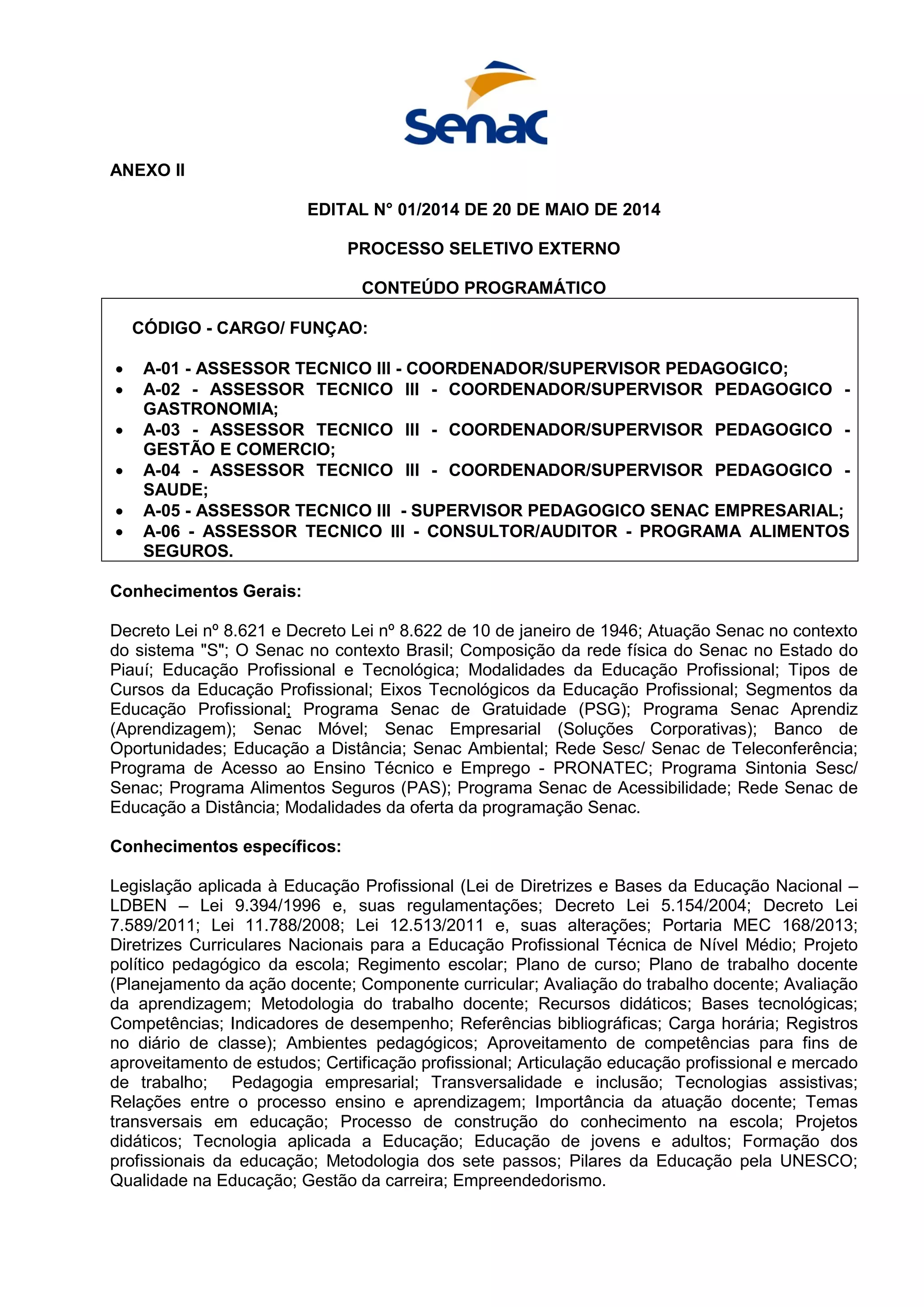 O documento descreve os requisitos de conhecimento para 12 cargos no Senac, incluindo coordenadores pedagógicos, consultores, administradores de recursos humanos, compras, contabilidade e banco de dados, assistentes técnicos de manutenção de computadores e secretaria. É especificado o conhecimento geral sobre o Senac e educação profissional e os conhecimentos específicos necessários para cada cargo.