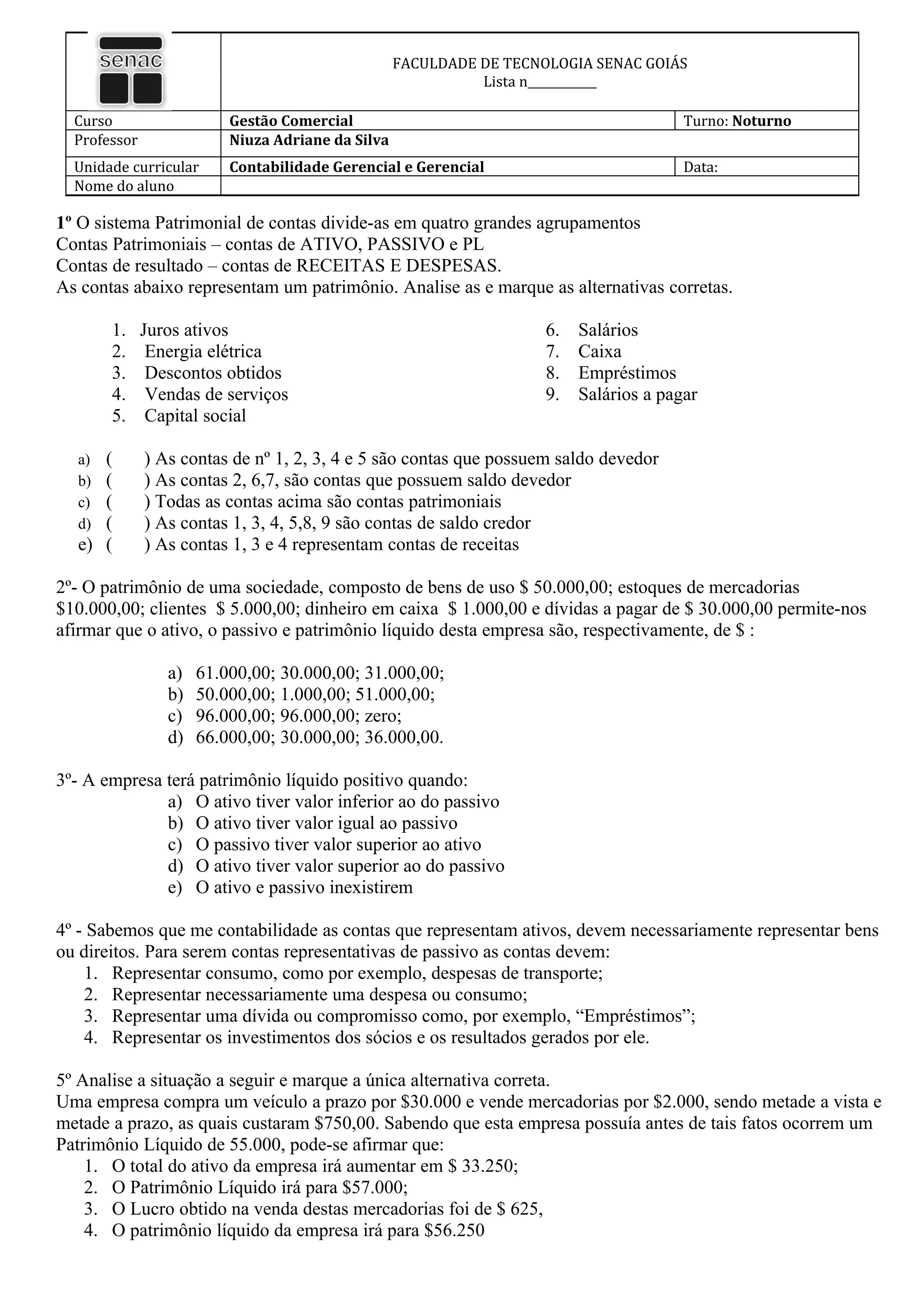 1) O documento apresenta uma lista de contabilidade gerencial e gerencial que inclui questões sobre contas patrimoniais, contas de resultado, classificação de contas e situações patrimoniais de empresas.