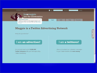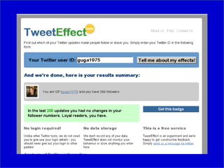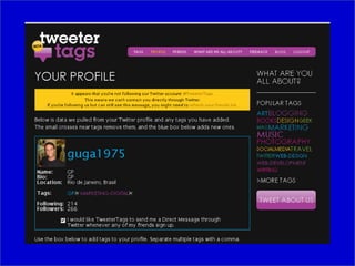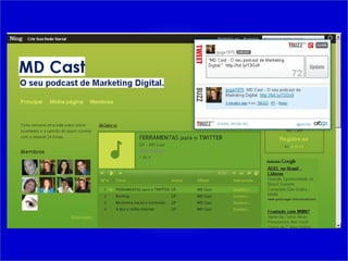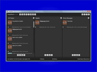 O documento discute várias profissões digitais emergentes e ferramentas para gestão de redes sociais como Twitter. Ele lista profissões como webwriter, copywriter, blogger profissional, gerente de redes sociais, analista de palavras-chave e outros. Também fornece detalhes sobre ferramentas como TweetDeck, 8hands e serviços como TBUZZ para marketing de boca a boca digital.