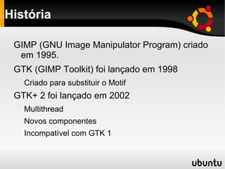 O documento resume: 1) A história do GTK+, desde o seu lançamento em 1998 para substituir o Motif até a versão 2 lançada em 2002 com novas funcionalidades e incompatibilidade com a versão 1. 2) Os principais casos de sucesso do uso do GTK+ como no GIMP, GNOME, Maemo e Firefox. 3) As principais características do GTK+ como ser multiplataforma, orientado a eventos, escrito na linguagem C e bem documentado.