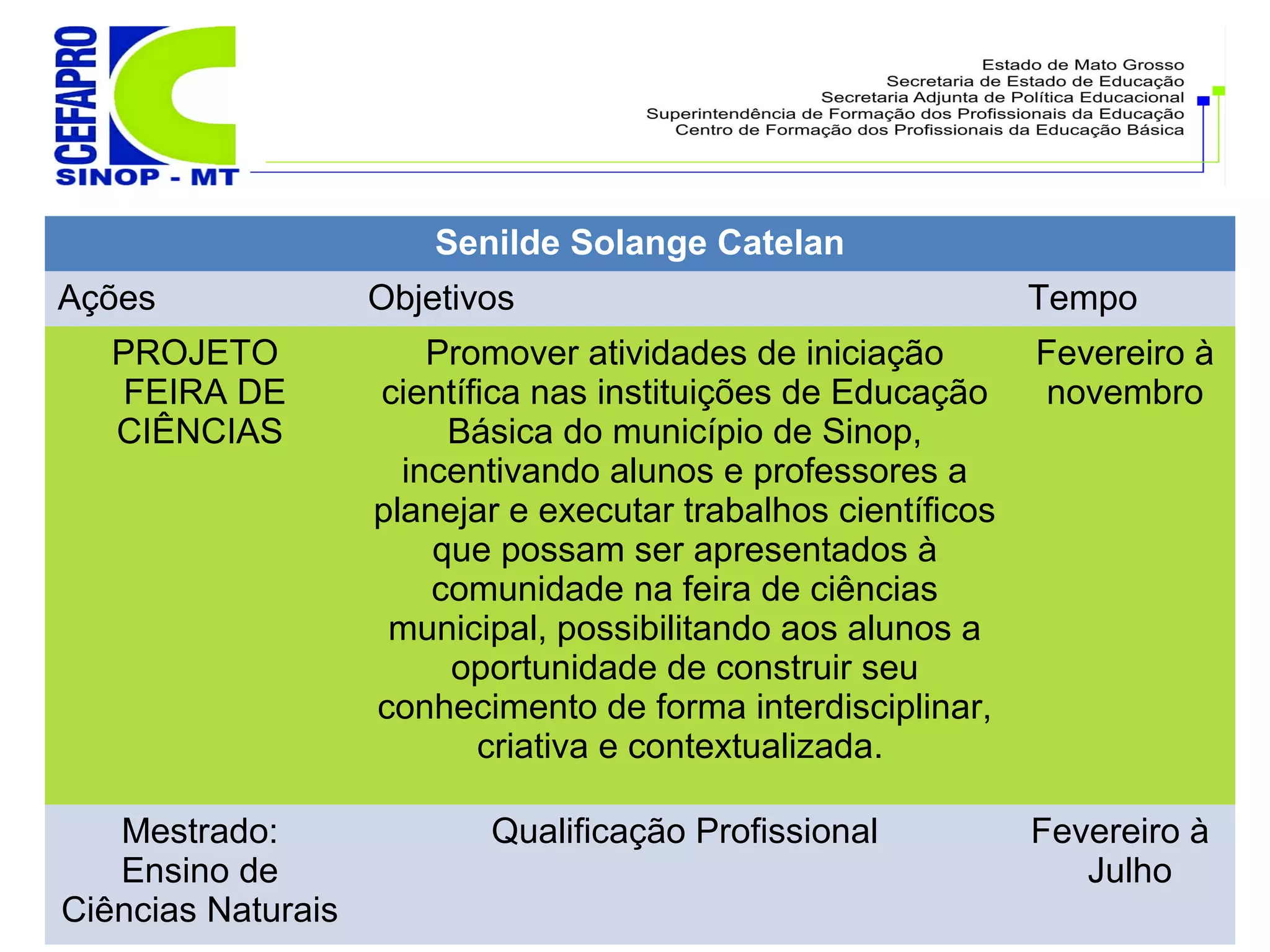 O documento descreve um projeto para promover atividades de iniciação científica em escolas de Sinop entre fevereiro e novembro, incluindo uma feira de ciências para apresentar trabalhos científicos dos alunos à comunidade. Também lista acompanhamentos em salas de educador e gestores em três escolas de Lucas do Rio Verde e Sinop entre fevereiro e julho, e formações locais sobre o Pacto Nacional pela Alfabetização em Cuiabá.