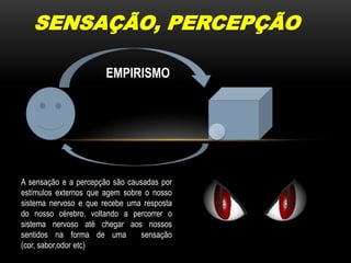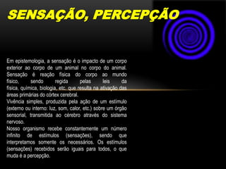 O documento discute as sensações e percepções humanas. Resume que as sensações são respostas físicas aos estímulos externos, enquanto a percepção envolve a interpretação dessas sensações no cérebro. Detalha os órgãos e mecanismos sensoriais para a visão, audição, olfato, tato e paladar.