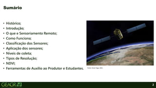 O documento explora o sensoriamento remoto, sua história e aplicações em diversas áreas, desde a agricultura até a meteorologia. Aborda como os sensores capturam dados por meio da radiação eletromagnética e classifica os tipos de sensores em ativos e passivos. Além disso, apresenta o Índice de Vegetação por Diferença Normalizada (NDVI), uma ferramenta essencial para monitoramento de culturas.