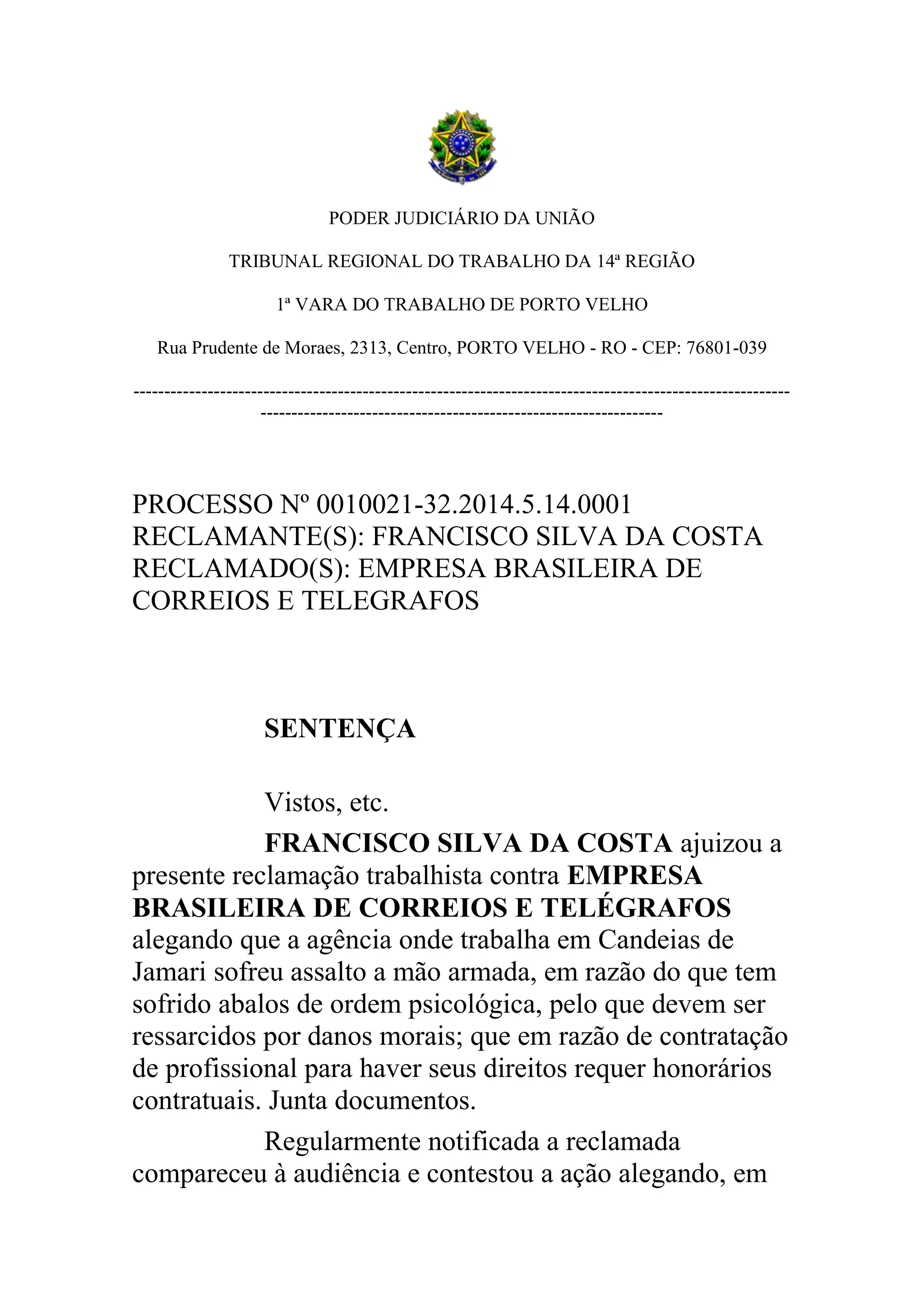 O documento é uma sentença trabalhista que condena parcialmente a Empresa Brasileira de Correios e Telégrafos a pagar indenização por danos morais no valor de R$80.000,00 a Francisco Silva da Costa, que sofreu abalos psicológicos após um assalto à agência onde trabalhava. A empresa foi considerada responsável por não garantir segurança adequada aos empregados.