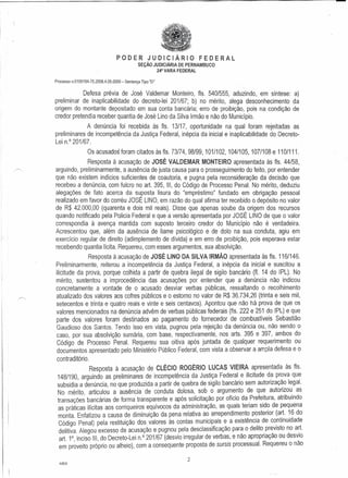 O documento descreve um processo judicial contra seis réus acusados de desvio irregular de recursos públicos federais. A denúncia alega que os réus, incluindo um prefeito e secretário de finanças, transferiram verbas do FUNDEF e do Bolsa Família para contas particulares. As defesas alegam preliminares e no mérito questionam a competência da Justiça Federal e alegam ausência de dolo, enquanto o juiz rejeita as preliminares e designa audiência para ouvir testemunhas.