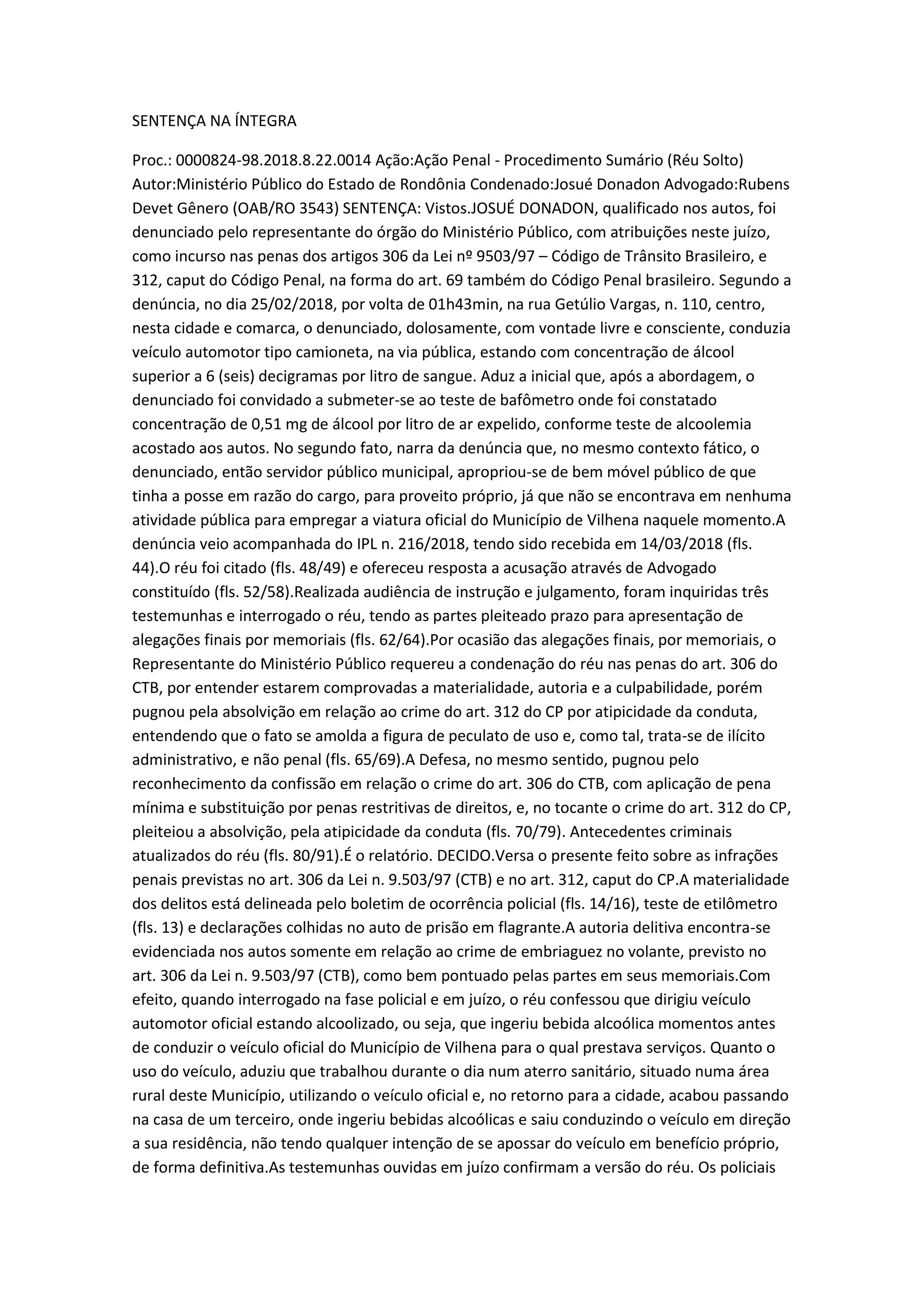 O réu foi condenado por dirigir veículo sob efeito de álcool com concentração acima do limite legal. Ele confessou o crime e testemunhas confirmaram sua versão. Foi absolvido da acusação de peculato por uso indevido do veículo público por falta de provas de apropriação definitiva, caracterizando apenas ilícito administrativo. Sua pena foi fixada em 9 meses de detenção e suspensão da carteira por 3 meses.