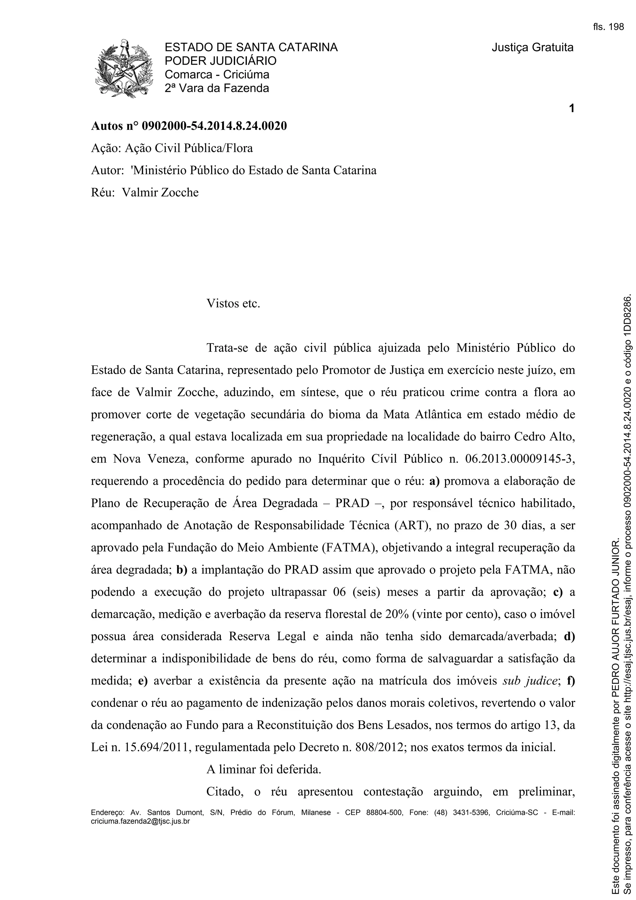 O Ministério Público moveu uma ação civil pública contra Valmir Zocche por corte irregular de vegetação nativa da Mata Atlântica em estágio médio de regeneração em sua propriedade. A Justiça julgou procedente o pedido do MP, condenando o réu a elaborar um plano de recuperação da área degradada e a outras medidas compensatórias, uma vez que ficou comprovado o corte da vegetação em desacordo com a legislação ambiental.