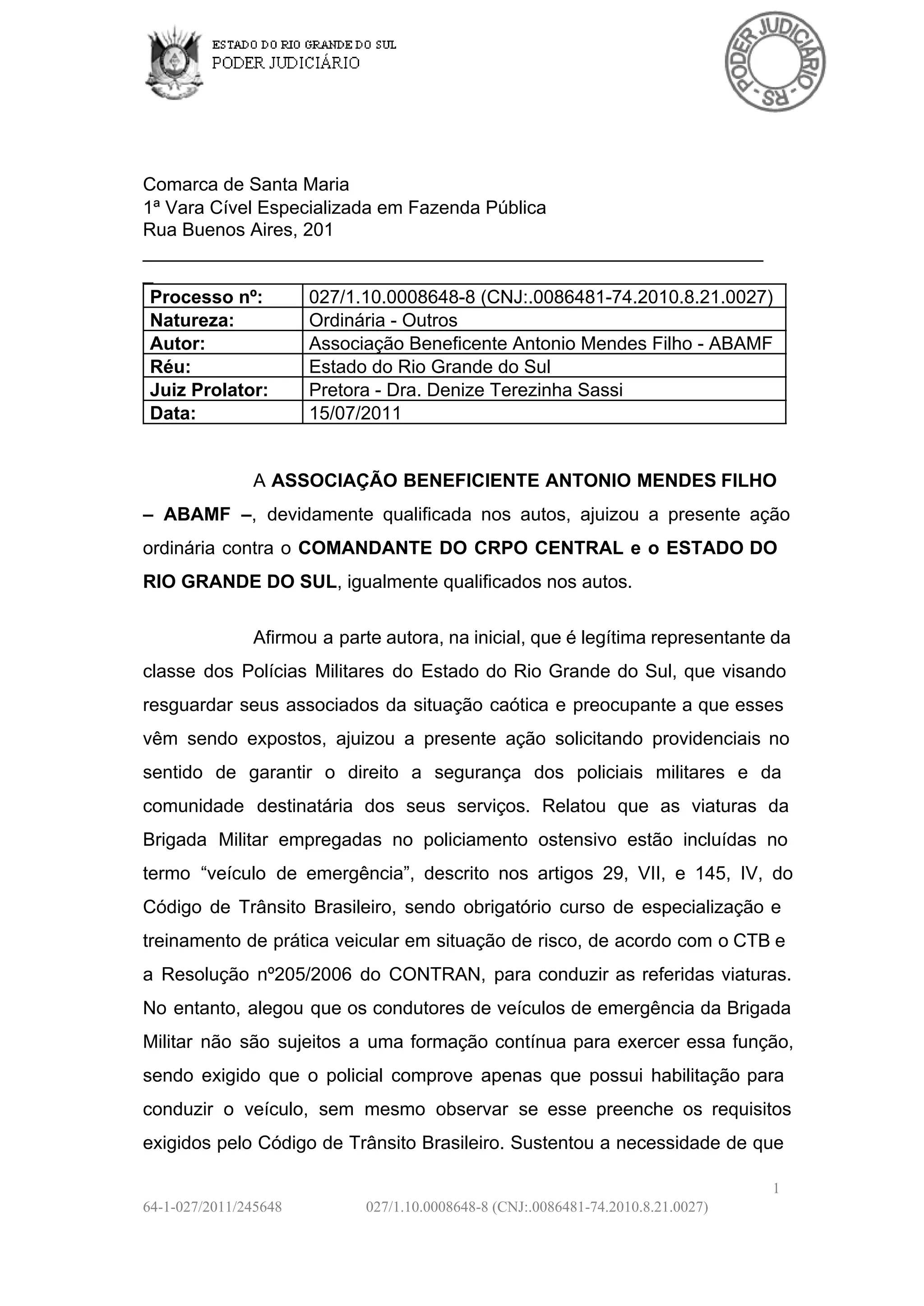 O documento descreve uma ação judicial movida pela Associação Beneficente Antonio Mendes Filho contra o Estado do Rio Grande do Sul. A ação alega que os policiais militares que conduzem veículos de emergência não recebem treinamento adequado, colocando em risco sua segurança e da população. O Estado contesta a ação, afirmando que já fornece treinamento específico para condutores de veículos de emergência.