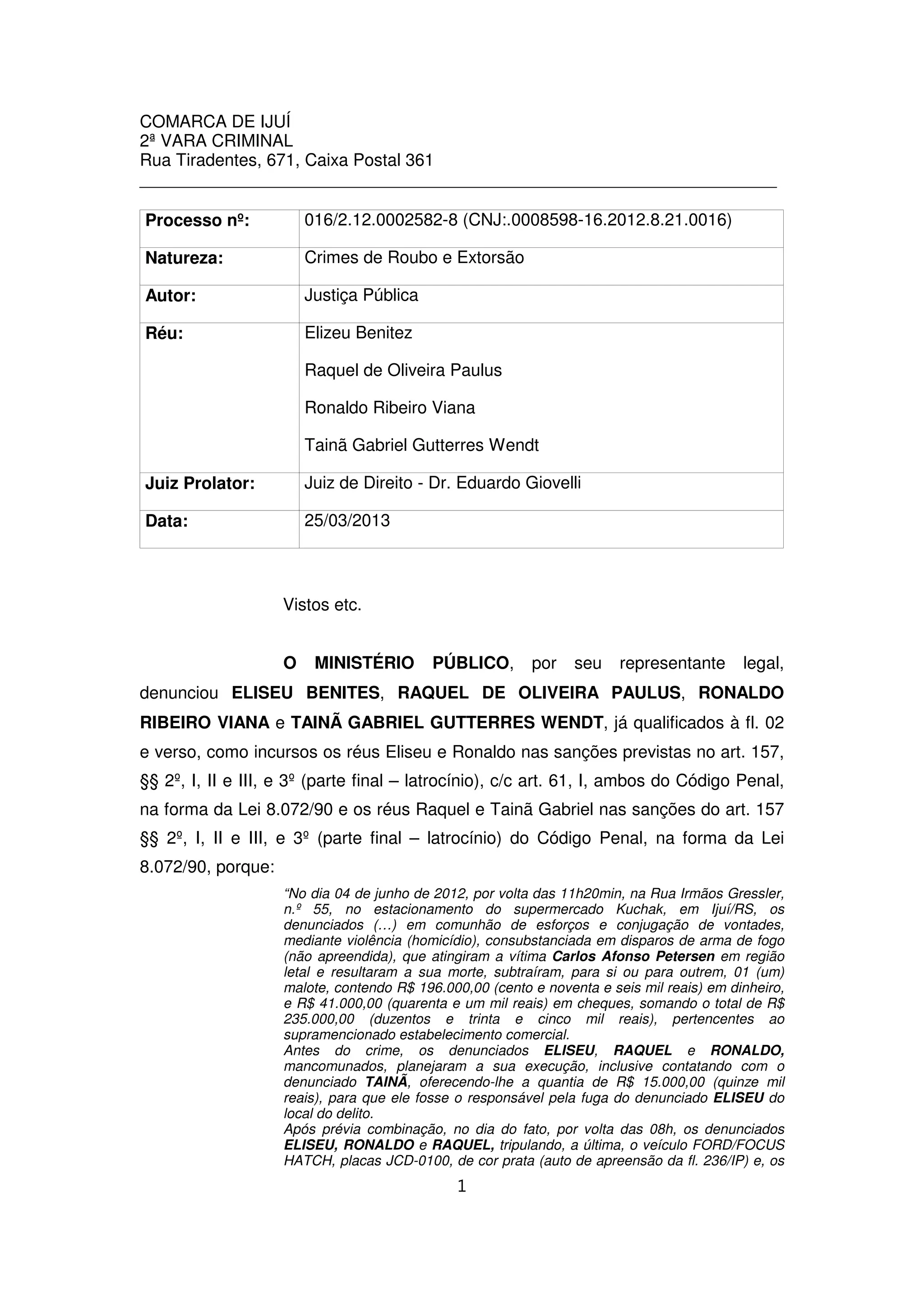 Este documento descreve um processo criminal contra quatro réus acusados de roubo e extorsão que resultou na morte da vítima. Os réus planejaram e executaram o roubo de dinheiro e cheques de um supermercado, durante o qual um dos réus matou a vítima a tiros. A polícia realizou buscas e apreensões e prendeu três dos réus preventivamente baseado nas evidências coletadas.