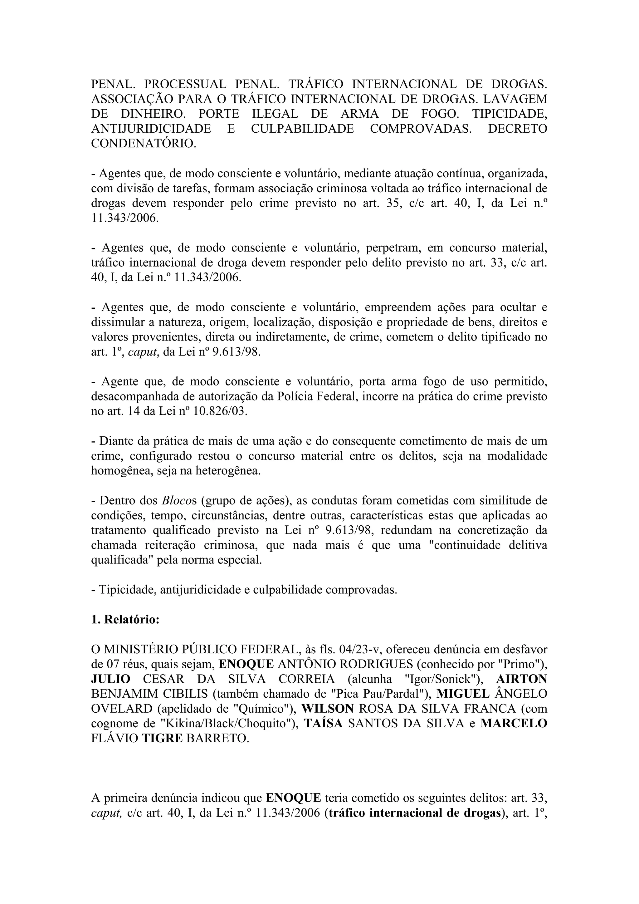 O documento descreve uma denúncia do Ministério Público Federal contra sete réus por crimes de tráfico internacional de drogas, associação para o tráfico, lavagem de dinheiro e porte ilegal de arma. A denúncia alega que os réus formavam uma organização criminosa liderada por ENOQUE que importava cocaína do Paraguai para vender no Nordeste do Brasil.