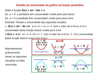 A concavidade de uma função quadrática f(x) = ax2 + bx + c depende do sinal do coeficiente a. Se a < 0, a concavidade está virada para baixo. Se a > 0, a concavidade está virada para cima. O documento apresenta dois exemplos ilustrando essas propriedades.