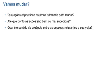 Este documento discute a importância de se ter um verdadeiro sentido de urgência versus complacência ou falsa urgência. Apresenta táticas para identificar esses comportamentos e aumentar o sentido de urgência, como trazer o ambiente externo para dentro da empresa, agir com urgência todos os dias, encontrar oportunidades em crises, e lidar com resistências. Também fornece dicas sobre como manter a urgência alta após o sucesso e cultivar uma cultura do sentido de urgência.