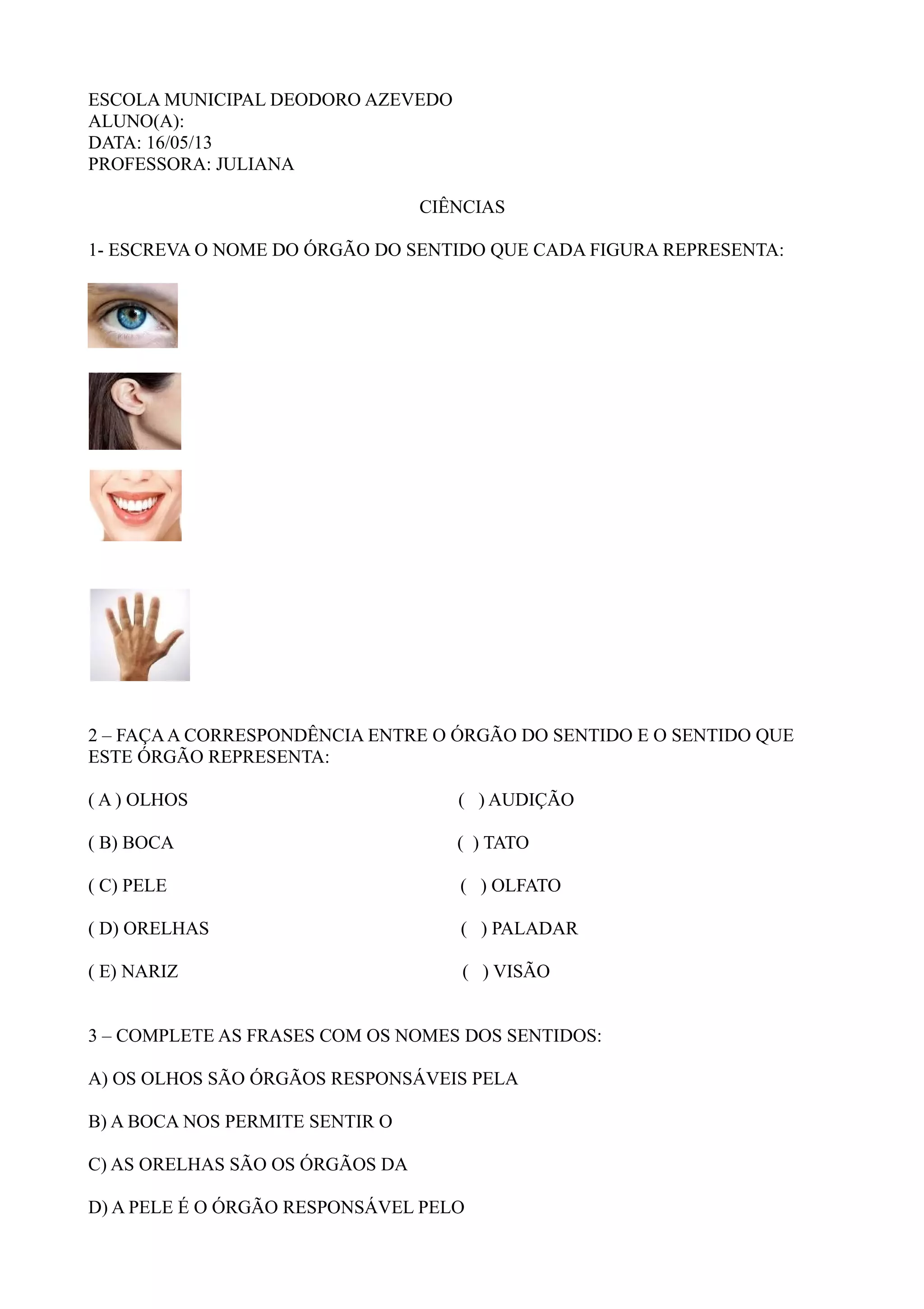 O documento é um teste de ciências sobre os sentidos humanos. Ele contém perguntas sobre os órgãos dos sentidos e suas funções, correspondendo cada órgão a um dos cinco sentidos: visão, audição, olfato, paladar e tato.