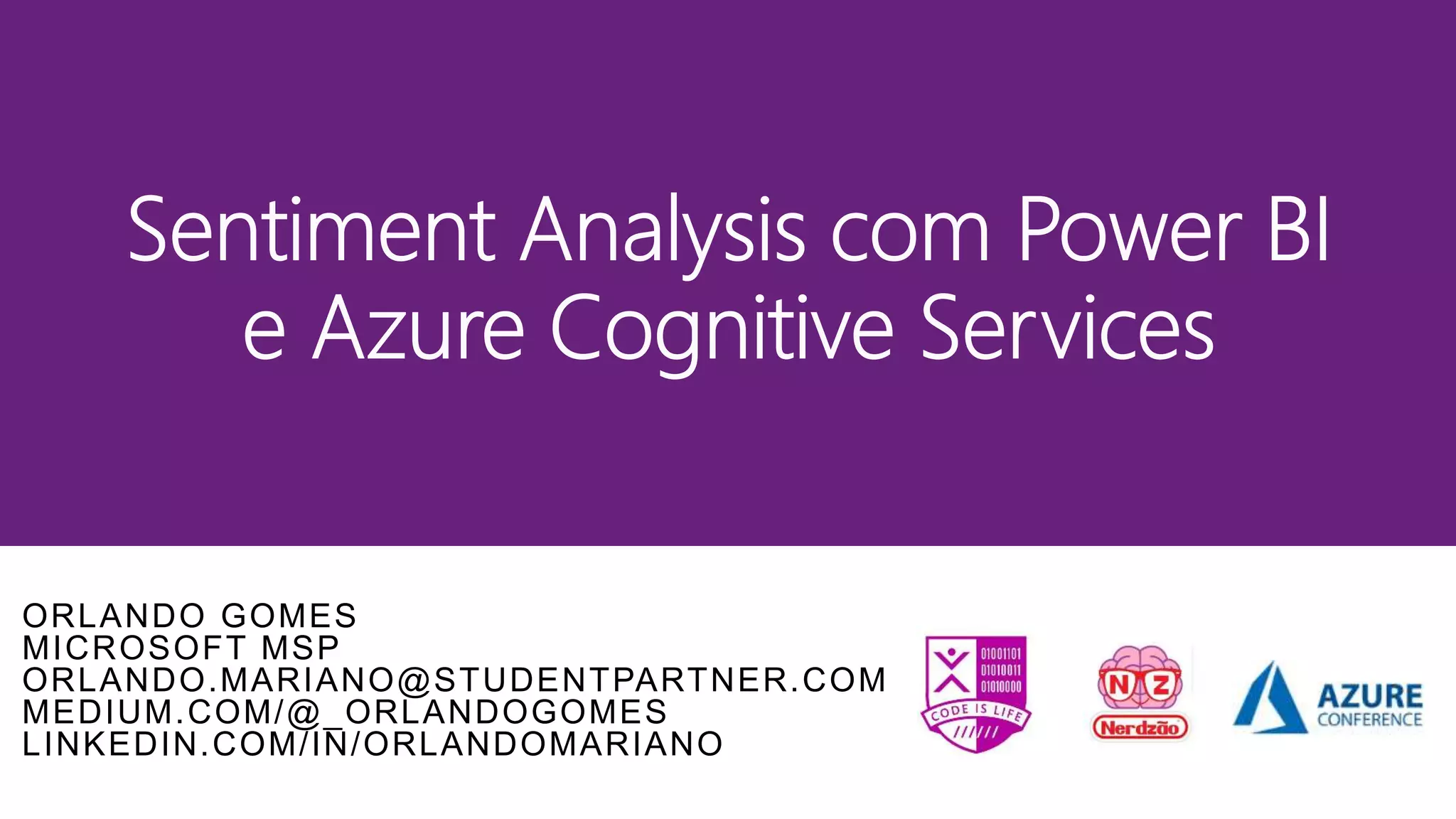 Orlando Gomes é consultor de BI e graduando em engenharia mecatrônica, com foco em Power BI e serviços cognitivos da Microsoft. O documento aborda a análise de sentimentos e a arquitetura do ambiente Power BI, incluindo referências e links úteis relacionados. Existe também uma demonstração de uso da API de análise de sentimentos como exemplo prático.