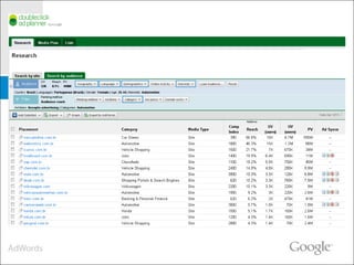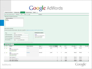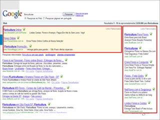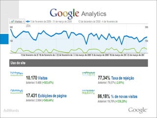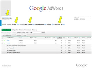 O documento discute estratégias de marketing digital como anúncios pagos na internet, ferramentas de análise de dados e otimização para mecanismos de busca (SEO) para melhorar o posicionamento orgânico de sites.
