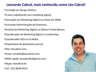 O documento fornece informações sobre otimização de sites para mecanismos de busca (SEO), abordando tópicos como: 1) O que é SEO e por que é importante; 2) Fatores importantes como tags title, description e URLs amigáveis; 3) Como selecionar as melhores palavras-chave.