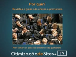 Este documento discute como otimizar sites para atrair mais hóspedes. Aponta que 30 milhões de pessoas buscam hospedagem online mensalmente e que estar entre os primeiros resultados do Google é crucial já que 60% das viagens começam online. Recomenda contratar uma agência de SEO para melhorar o ranqueamento do site e direcionar mais hóspedes potenciais ao negócio de forma barata e eficaz.