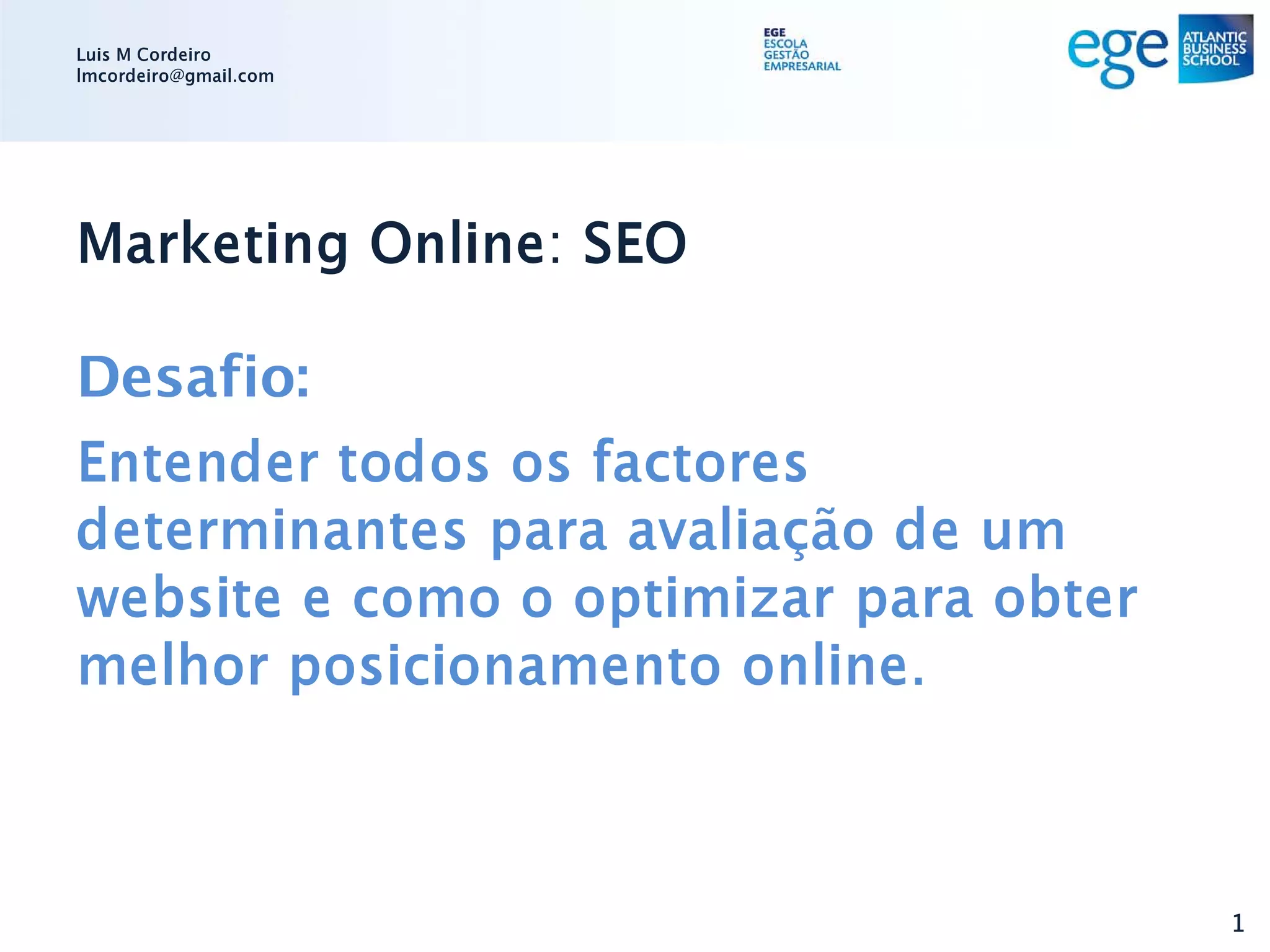 Este documento discute estratégias de otimização de mecanismos de pesquisa (SEO) para melhorar o posicionamento de sites na internet. Ele explica fatores como endereço, conteúdo, links e autoridade social que determinam a classificação de um site e fornece exemplos de como esses fatores afetam o ranqueamento do Google PageRank.