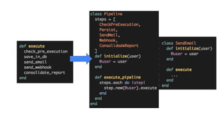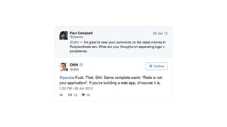 O documento discute como separar as regras de negócio do framework Rails para tornar o código mais desacoplado e facilitar manutenção e testes. Sugere usar objetos como Form Objects, Presenter Objects, Policy Objects e Service Objects para encapsular diferentes responsabilidades em vez de colocar tudo em controllers e models. Ao final, encoraja estudar programação orientada a objetos e arquitetura para produzir códigos mais limpos e desacoplados.