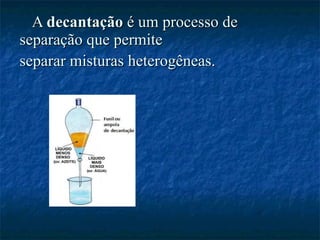 A decantação é um processo de separação heterogêneo que permite separar misturas através da sedimentação ou da diferença de densidade entre fases. Envolve deixar a mistura em repouso para que a fase mais densa se separe da menos densa, possibilitando a remoção de uma das fases. Exemplos são a separação de água e óleo ou de água e areia.