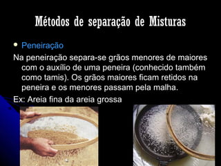 O documento descreve vários métodos de separação de misturas, incluindo peneiração, levigação, decantação, centrifugação, dissolução fracionada e destilação. Ele fornece exemplos de como cada método pode ser usado para separar sistemas heterogêneos específicos.