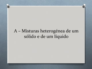 O documento descreve vários métodos para separar componentes de misturas, incluindo decantação, filtração, centrifugação, peneiração, magnetização, sublimação, extração por solvente e decantação em funil para misturas sólidas e líquidas heterogêneas, e cristalização, cromatografia e destilação para misturas homogêneas líquidas.