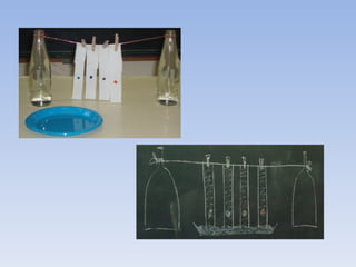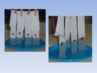 Quatro tiras de papel absorvente foram colocadas em um prato com água contendo tinta colorida. A água dissolveu a tinta, que se separou nas cores primárias que a compunham, demonstrando como a tinta branca é formada por uma mistura de cores.