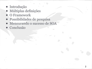 O documento analisa o conceito de SOA (Arquitetura Orientada a Serviços) até 2008, destacando as dificuldades em definir a metodologia e mensurar seu sucesso. Apresenta um framework para SOA e categoriza direções de pesquisa como exploração de ferramentas existentes e investigações empíricas. A conclusão ressalta a falta de consenso sobre definições e a necessidade de identificar métricas eficazes para avaliar a implementação do SOA.