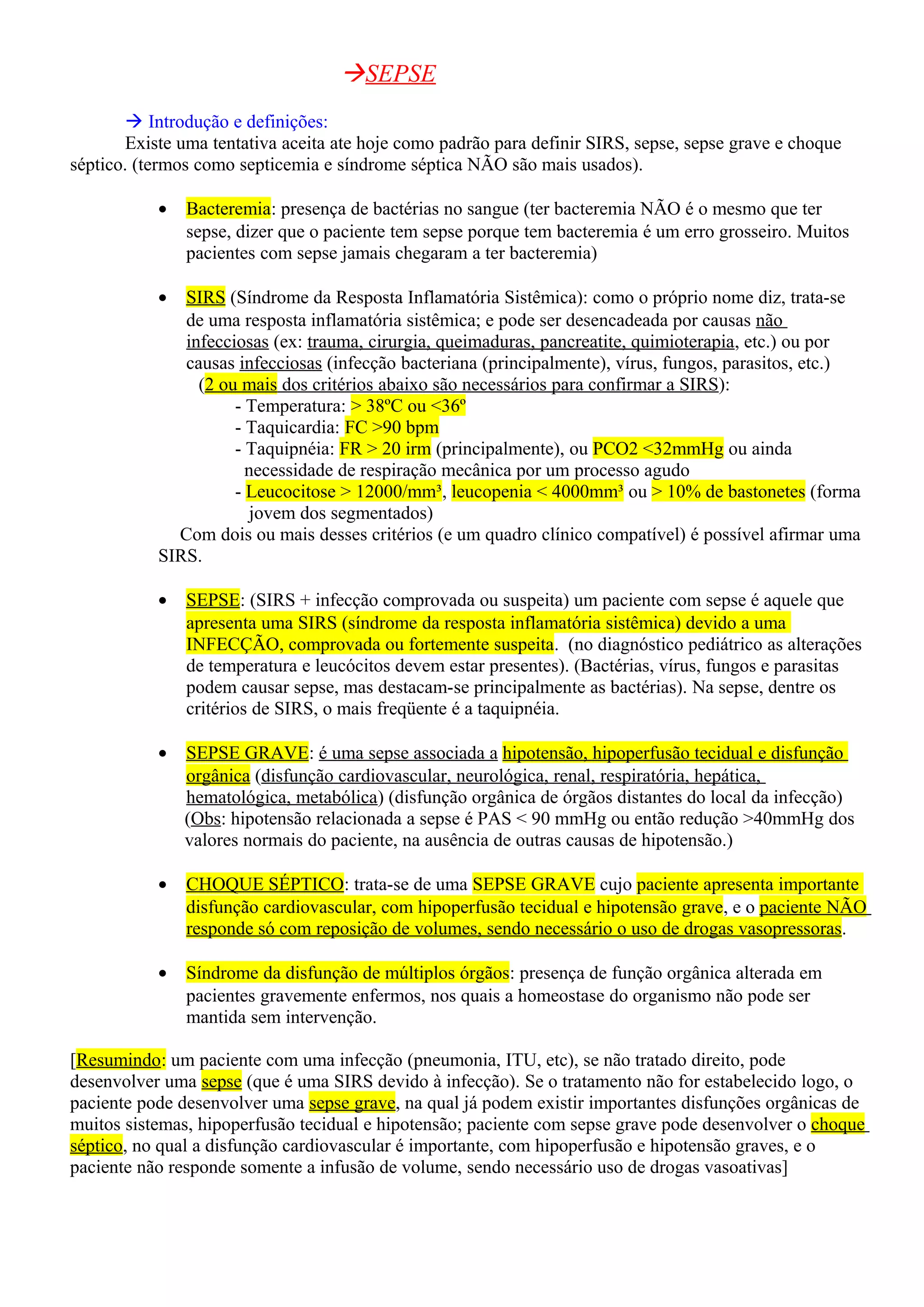 O documento define os termos relacionados à sepse como SIRS, sepse, sepse grave e choque séptico. Explica que a sepse ocorre quando há uma infecção associada à SIRS, e pode evoluir para sepse grave com disfunção de órgãos ou choque séptico se não tratada. Detalha também a fisiopatologia da sepse, que envolve a ativação descontrolada do sistema imunológico e lesão de órgãos devido à liberação excessiva de citocinas e outros mediadores inflamatórios.